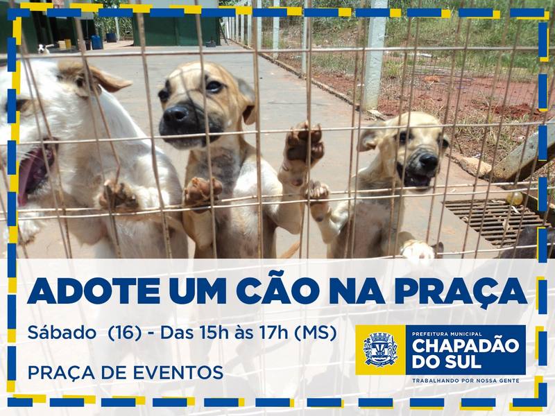 A Prefeitura de Chapadão do Sul e a Secretaria de Desenvolvimento Econômico e Meio Ambiente, através do Canil Municipal, realizarão no sábado, 16, a campanha de adoção de animais, na Praça de Evento. A ação iniciará às 15h e irá até às 17h (MS).