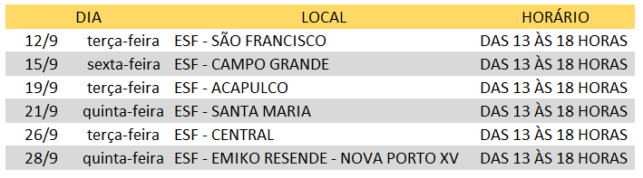 Na sexta-feira, dia 15 de setembro, o cronograma tem sequência com a vacinação sendo realizada no ESF “Dr. Lúcio Ferreira Rosa”, no bairro Jardim Campo Grande, das 13 às 18 horas (horário de Brasília).