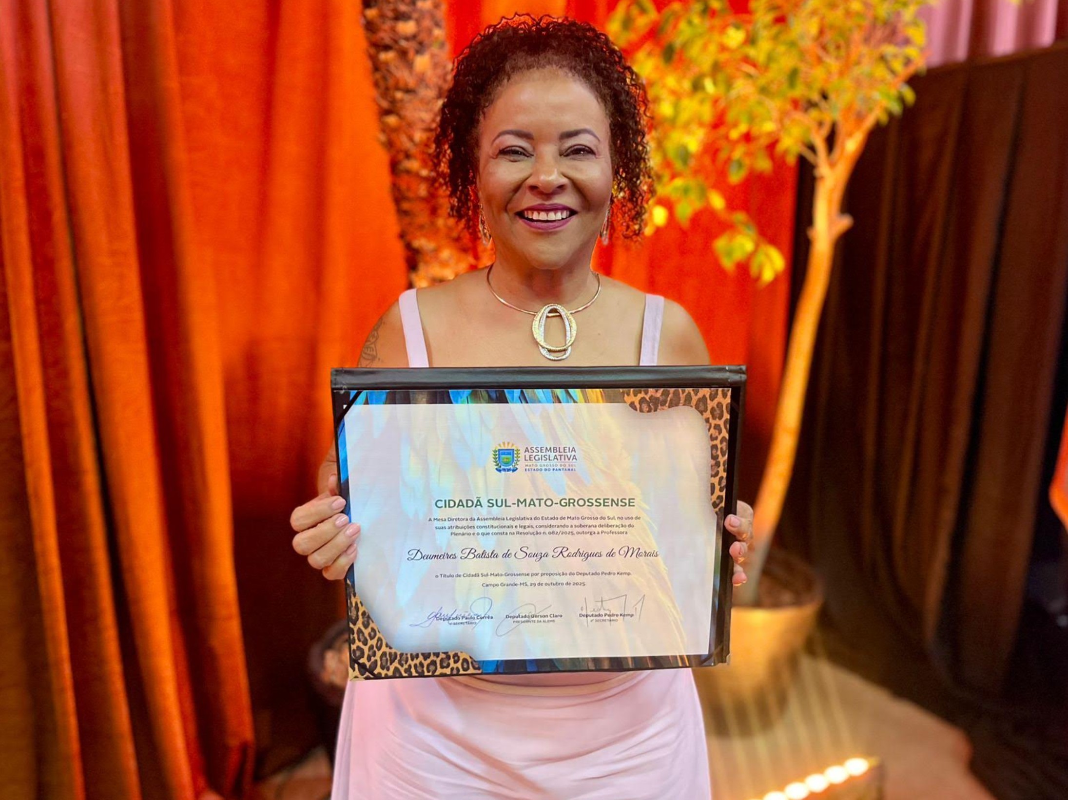 A presidenta da FETEMS (Federação dos Trabalhadores em Educação de Mato Grosso do Sul), professora Deumeires Morais, recebeu na noite de quarta-feira (29) o Título de Cidadã Sul-Mato-Grossense, durante sessão solene da Assembleia Legislativa de Mato Grosso do Sul (ALEMS). O evento foi realizado no Palácio Popular da Cultura, no auditório Manoel de Barros, em Campo Grande, e reuniu autoridades, representantes de entidades e lideranças da educação.